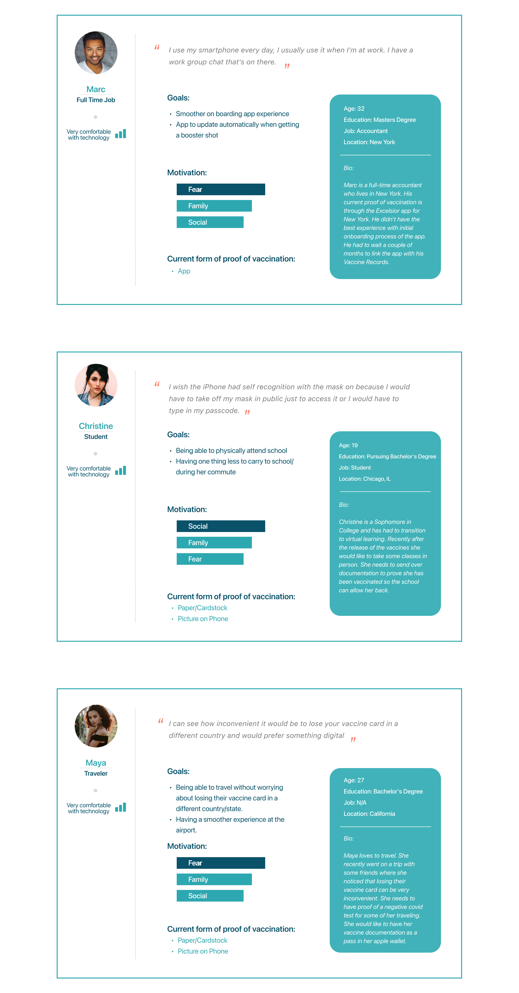The overarching theme from the user interviews was that people would prefer a digitalized Covid-19 vaccination card rather than a piece of paper that they carry everywhere. Even though a location specific app might exist for users, it does not offer an optimal experience, causing more stress than they're willing to put up with.