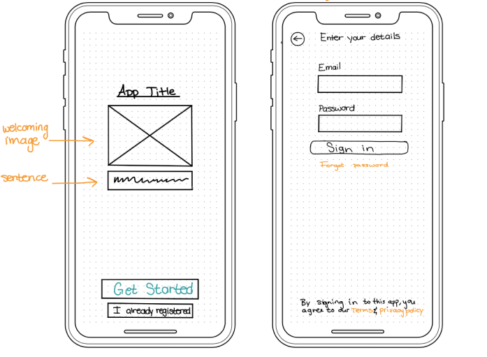 Sketches based on the research and user interviews. Each pair of sketch below represent part of my 4 flows that I was focusing on.