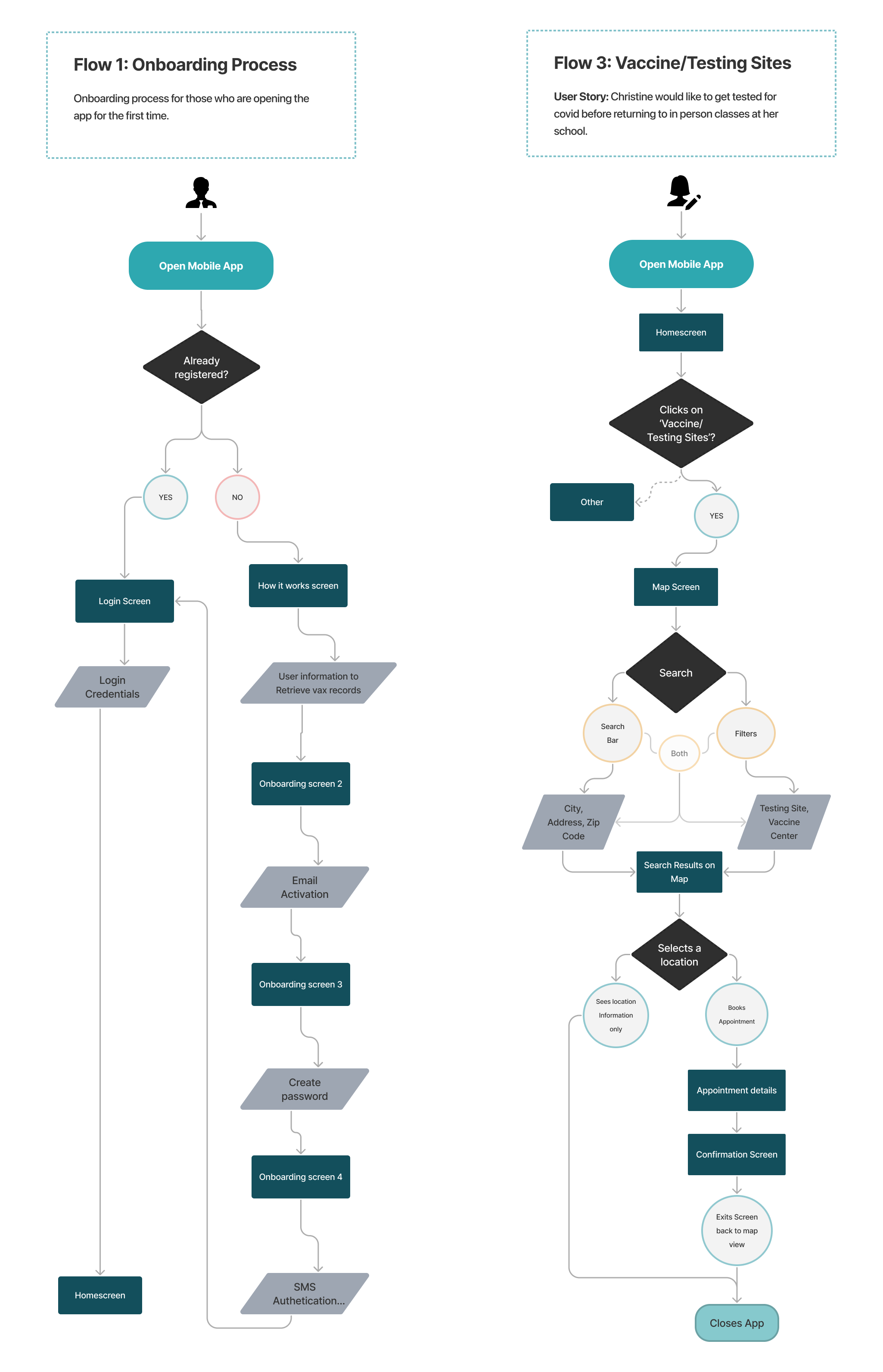 User flows were created to help map out the process of each task that was determined in the sitemap. Here are 2 of the flows: